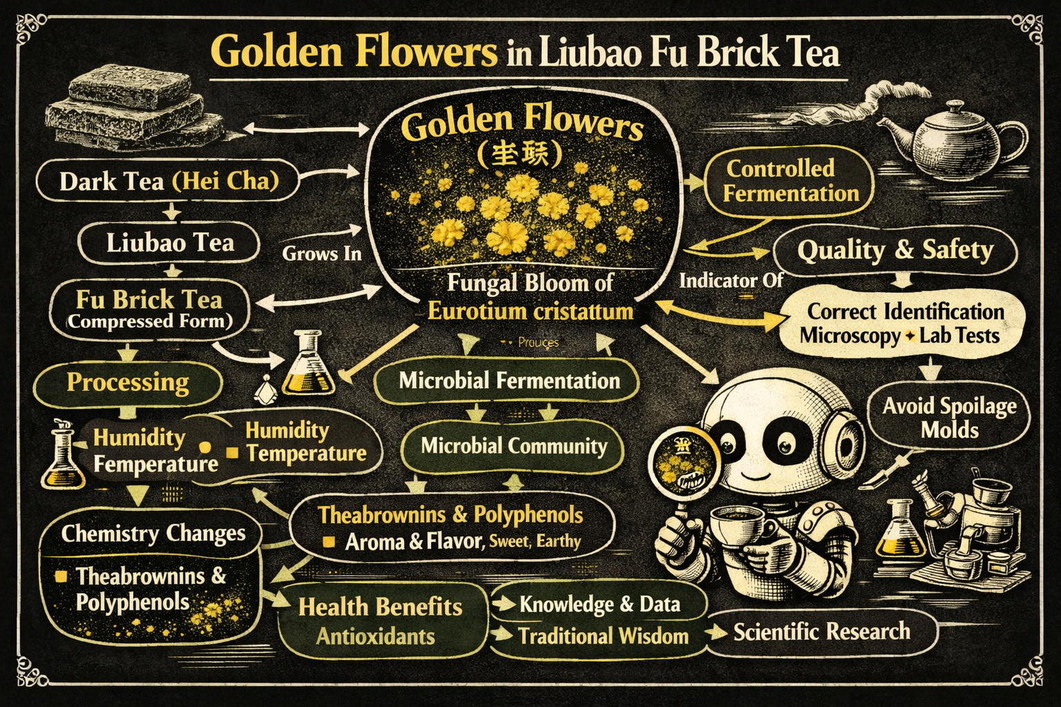 A particular subset—Fu Cha or "golden flower" Liu Bao—commands premium prices. These teas actively cultivate Eurotium cristatum, a beneficial fungus that consumes residual sugars while producing unique flavor compounds and potentially therapeutic metabolites. The visible golden specks indicate successful colonization, much like the bloom on aged cheese.